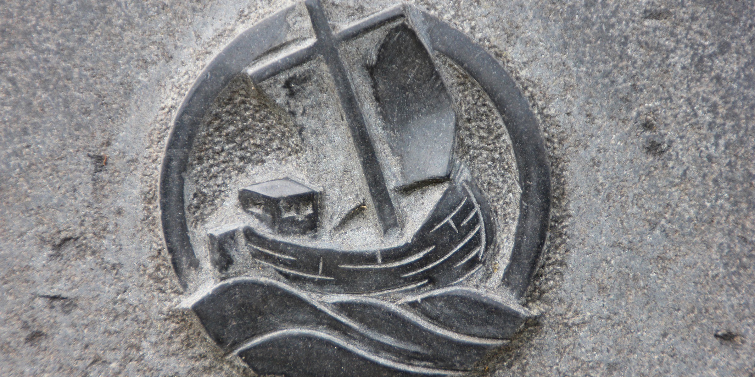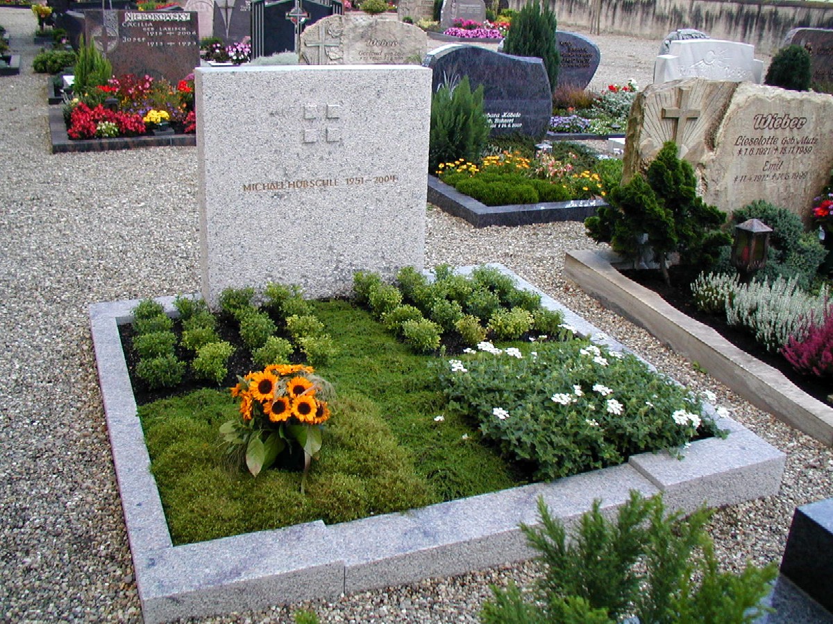 Hier handelt es sich um Granit- und Kalksteine. Bei den oberen beiden Steinen habe ich den Beruf der Verstorbenen in den Entwurf einfließen lassen. Die beiden unteren Steine sind mit der dazugehörigen Einfassung eine gestalterische Einheit, und die Angehörigen unterstreichen dies mit der passenden Bepflanzung. Das Schiff-Symbol ganz oben habe ich nach einer Fluchtgeschichte aus Danzig über die Ostsee entworfen.