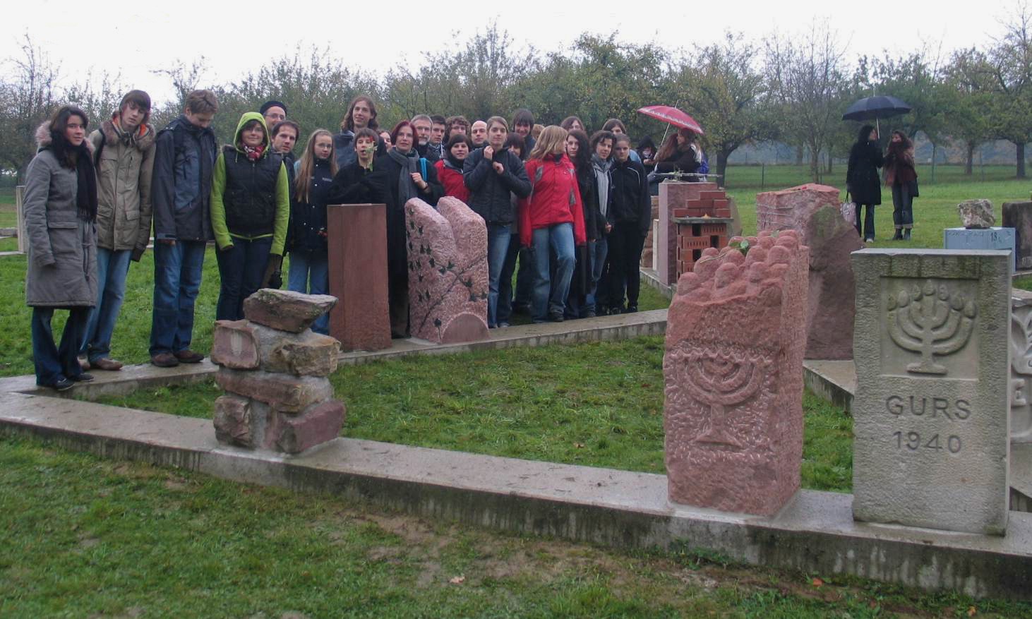 Zum Themenkomplex "Gurs" haben Schülerinnen und Schüler beider Gymnasien in Ettenheim jeweils zwei Gedenksteine in Stein gehauen (Foto unten zeigt einen der Steine: 2.v.r. auf dem zentralen Gedenkfeld in Neckarzimmern). Die Schüler hatten zuvor Entwürfe gemacht und diese unter meiner Anleitung umgesetzt (unten). Das Memorial und jeweils Zwillingssteine in den Gemeinden erinnern an die Deportation aller Juden aus Baden, der Pfalz und dem Saarland ins französische Lager Gurs 1940.